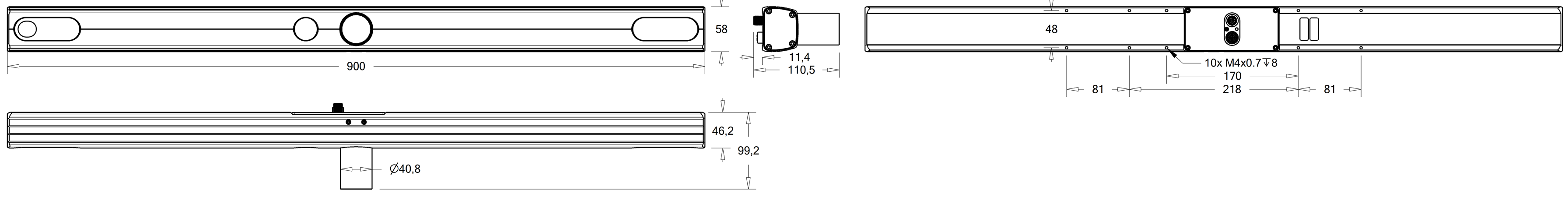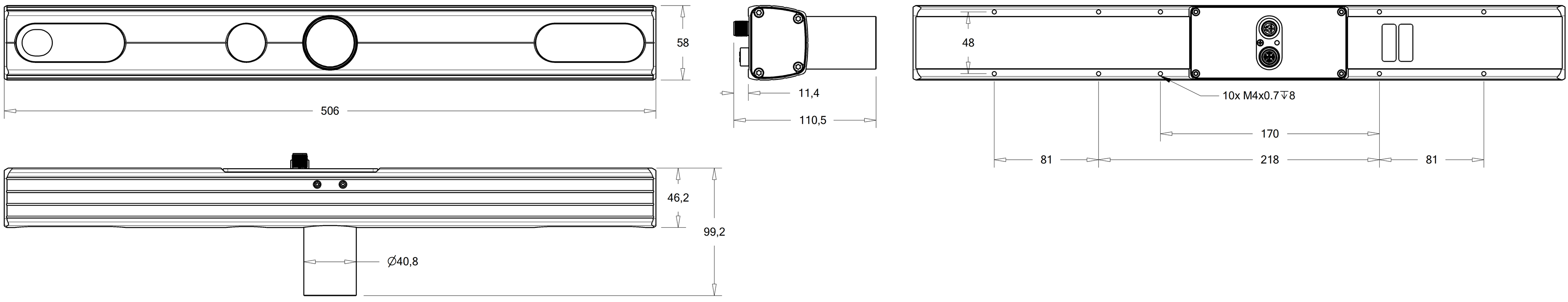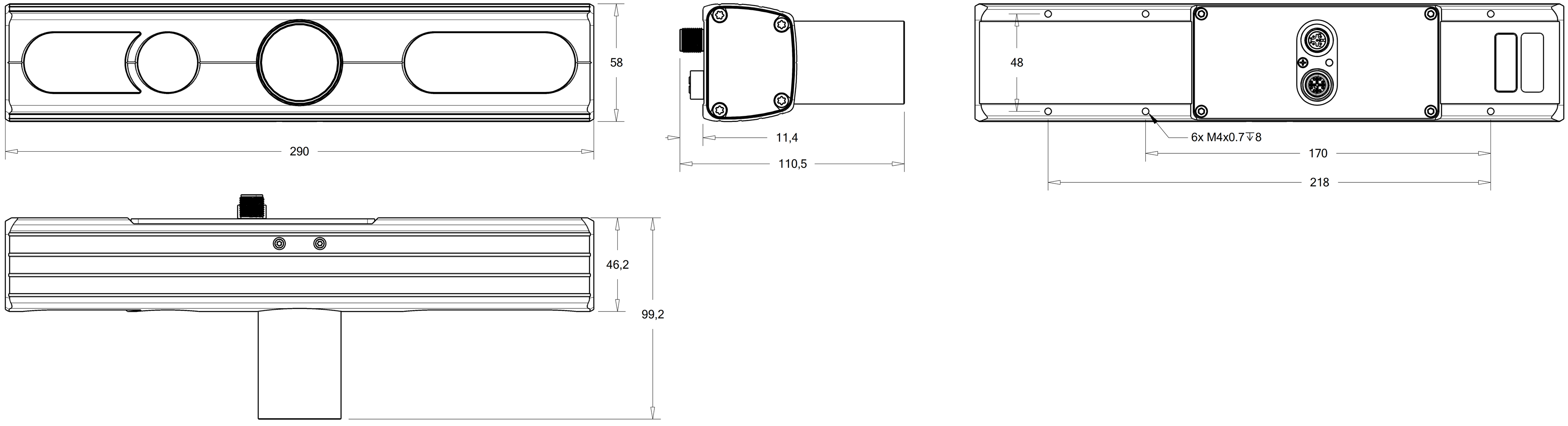 The device must be fixed by 4 M4 screws – two on each side of the connector panel – using 2.4 Nm of torque. The maximal thread depth is 8 mm. (See also the model-specific dimensions below.)